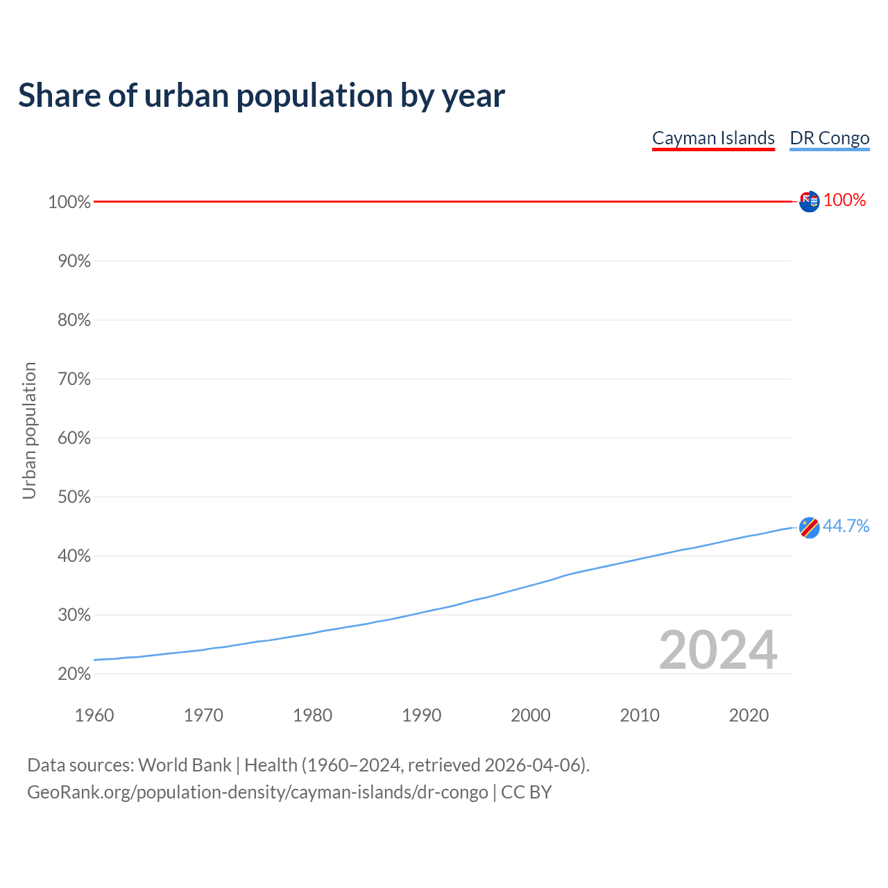 From 2004 to 2024, the share of urban population changed from 100% to 100% in the Cayman Islands and from 37% to 44.7% in the DR Congo.