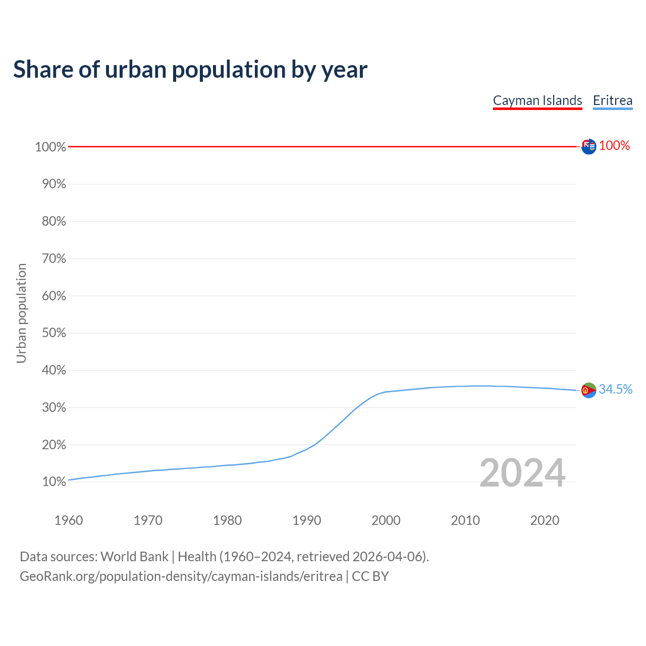 From 2004 to 2024, the share of urban population changed from 100% to 100% in the Cayman Islands and from 34.9% to 34.5% in Eritrea.