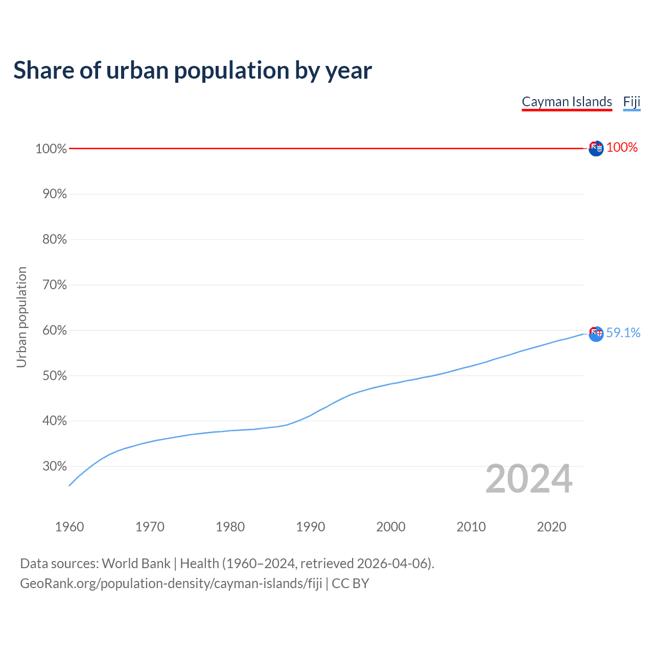 From 2004 to 2024, the share of urban population changed from 100% to 100% in the Cayman Islands and from 49.5% to 59.1% in Fiji.