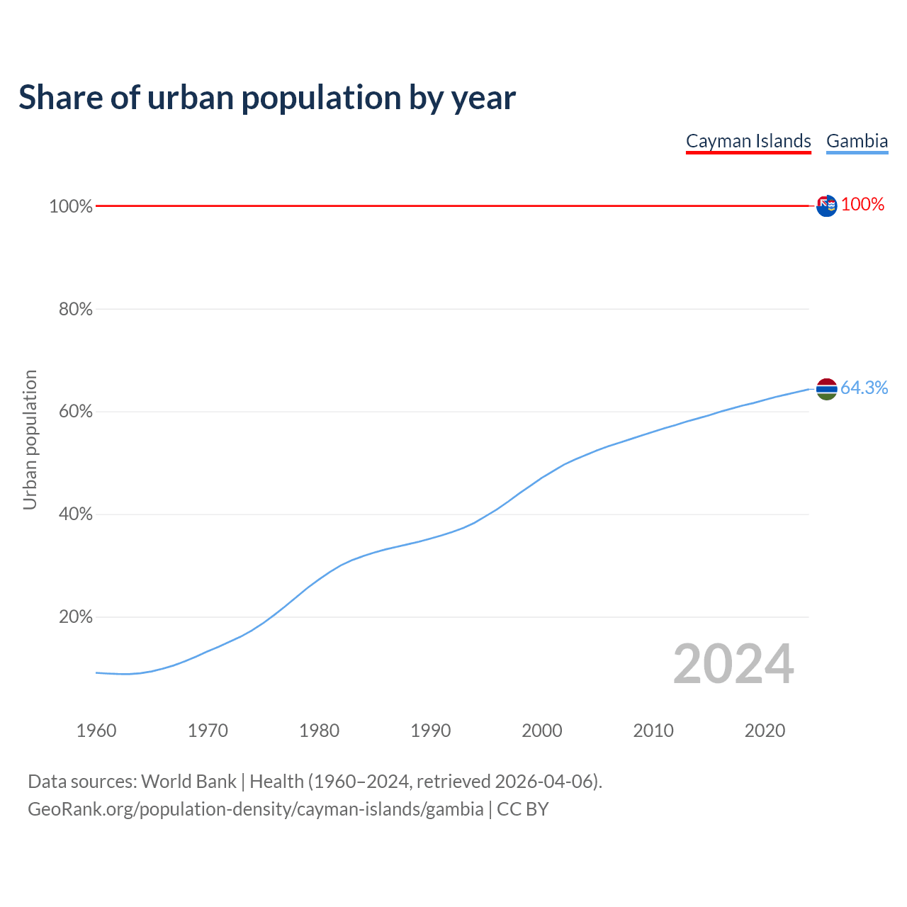 From 2004 to 2024, the share of urban population changed from 100% to 100% in the Cayman Islands and from 51.5% to 64.3% in the Gambia.