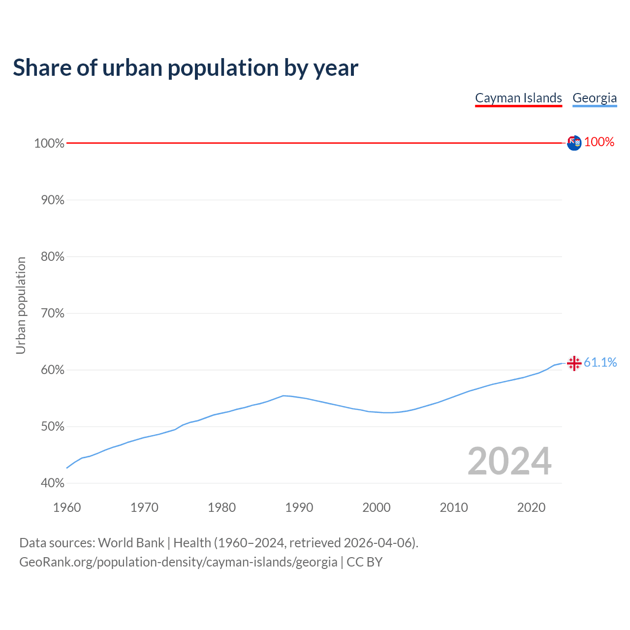 From 2004 to 2024, the share of urban population changed from 100% to 100% in the Cayman Islands and from 52.7% to 61.1% in Georgia.