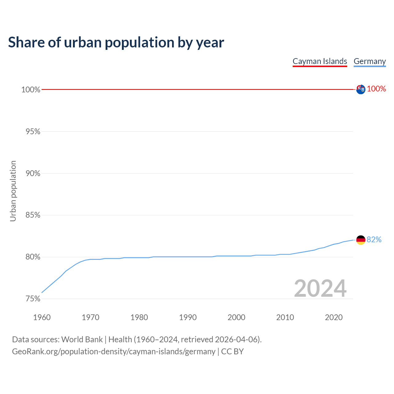 From 2004 to 2024, the share of urban population changed from 100% to 100% in the Cayman Islands and from 80.2% to 82% in Germany.