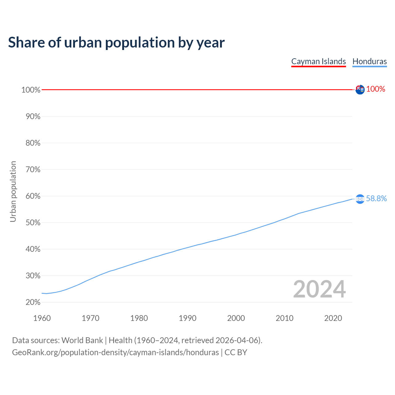 From 2004 to 2024, the share of urban population changed from 100% to 100% in the Cayman Islands and from 47.6% to 58.8% in Honduras.