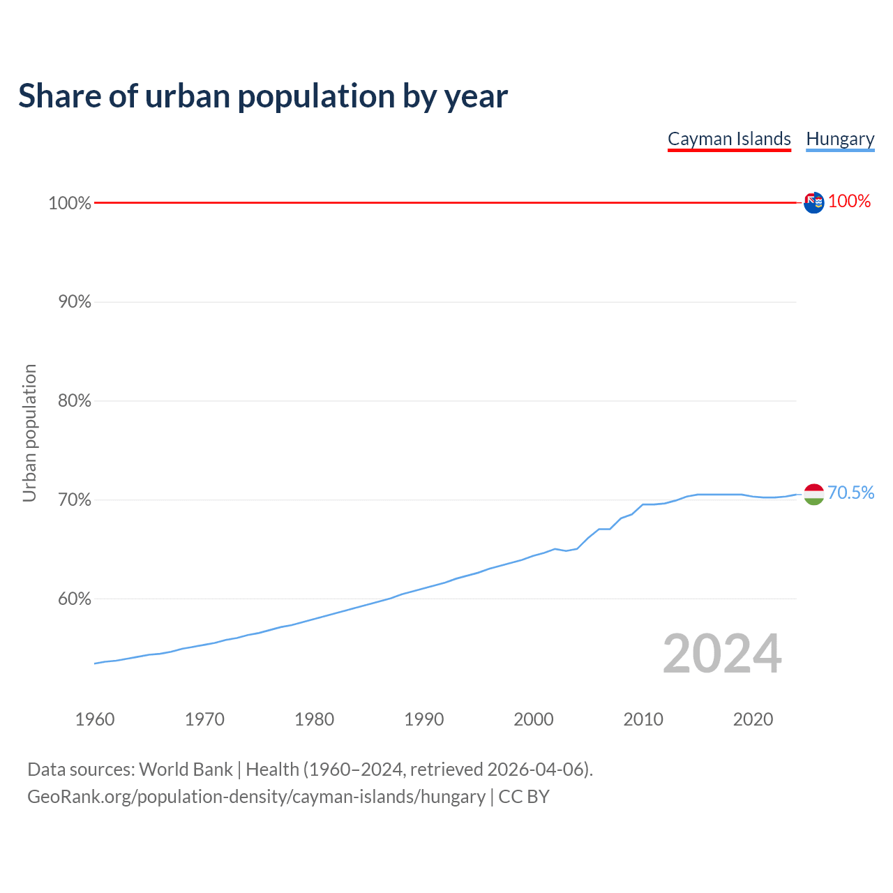 From 2004 to 2024, the share of urban population changed from 100% to 100% in the Cayman Islands and from 65% to 70.5% in Hungary.