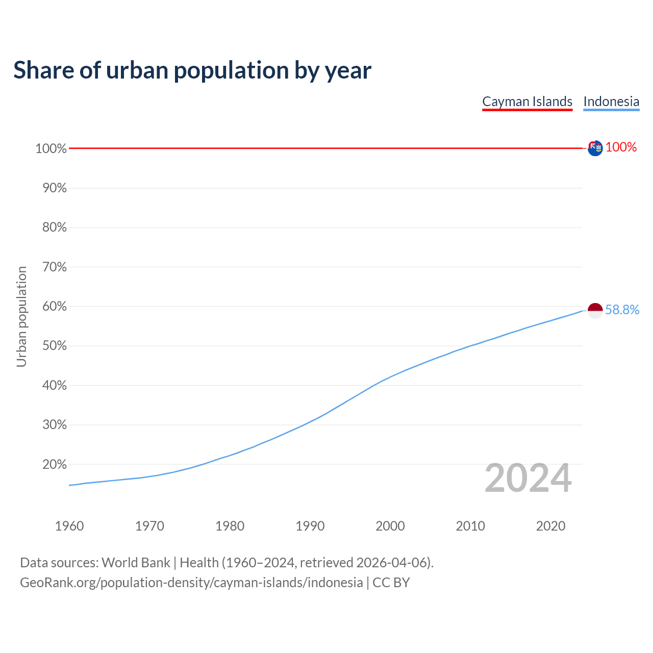 From 2004 to 2024, the share of urban population changed from 100% to 100% in the Cayman Islands and from 45.4% to 58.8% in Indonesia.