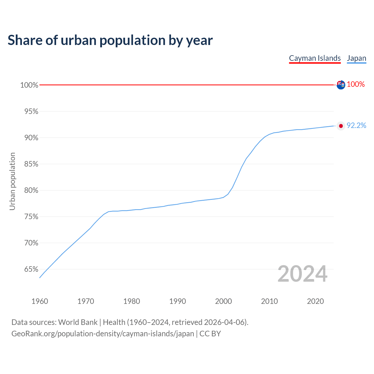 From 2004 to 2024, the share of urban population changed from 100% to 100% in the Cayman Islands and from 84.4% to 92.2% in Japan.