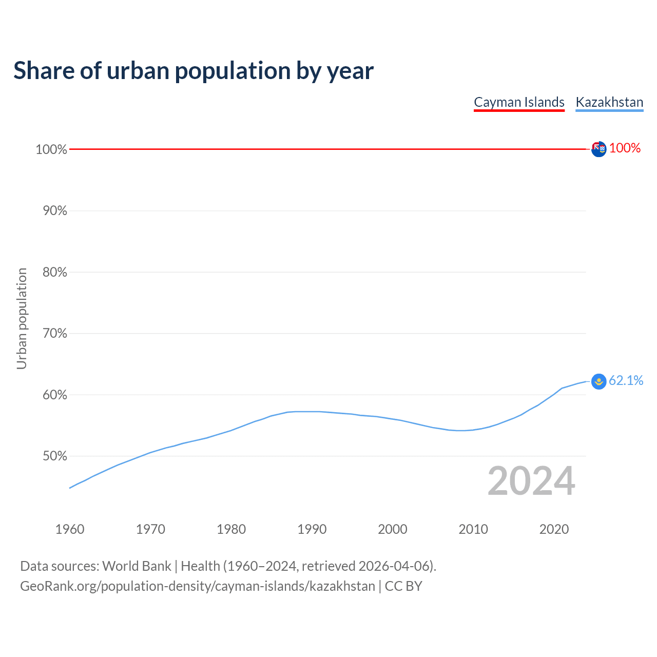 From 2004 to 2024, the share of urban population changed from 100% to 100% in the Cayman Islands and from 54.9% to 62.1% in Kazakhstan.