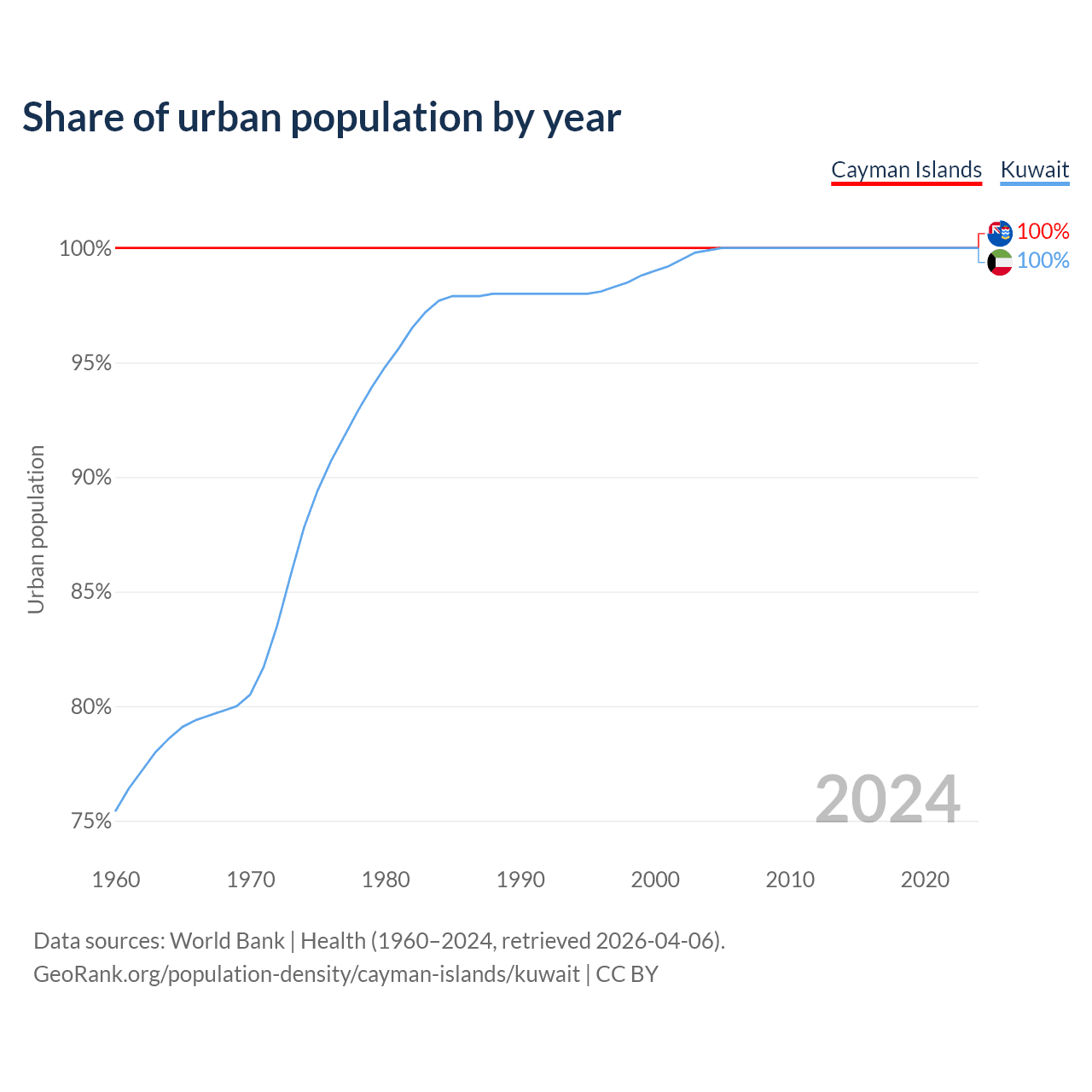 From 2004 to 2024, the share of urban population changed from 100% to 100% in the Cayman Islands and from 99.9% to 100% in Kuwait.