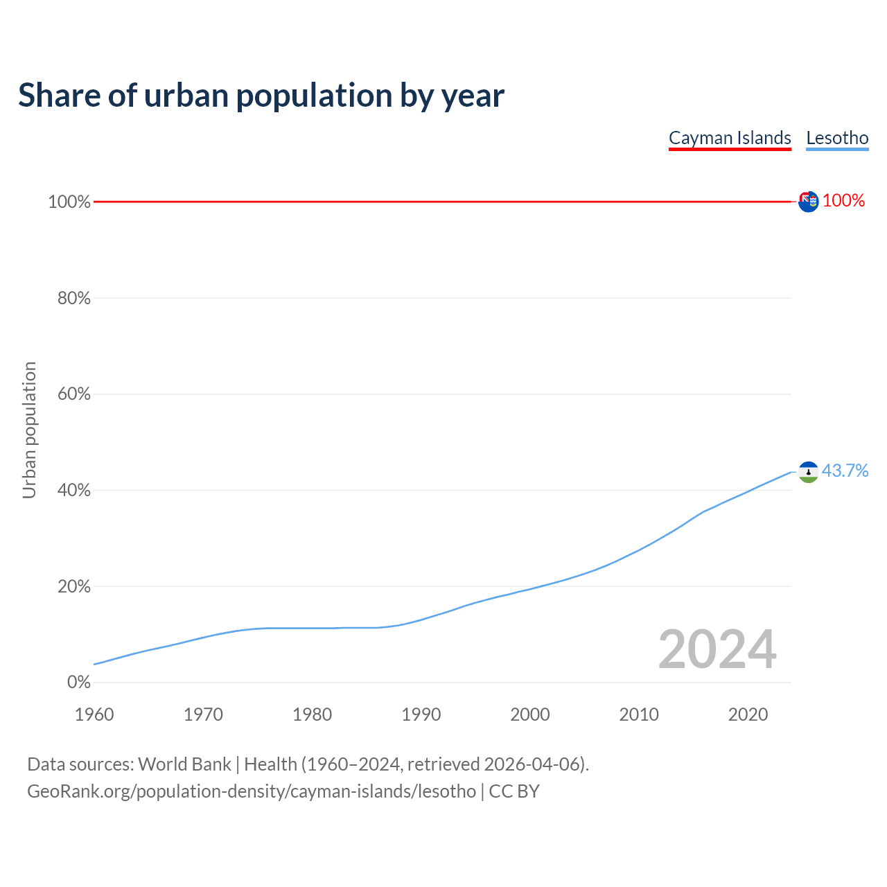 From 2004 to 2024, the share of urban population changed from 100% to 100% in the Cayman Islands and from 21.8% to 43.7% in Lesotho.