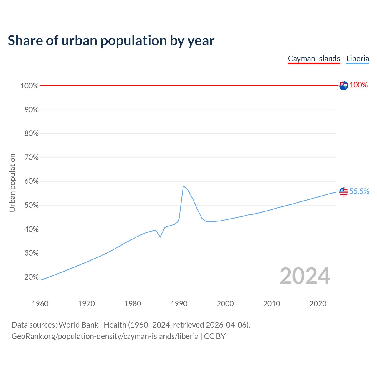 From 2004 to 2024, the share of urban population changed from 100% to 100% in the Cayman Islands and from 45.4% to 55.5% in Liberia.
