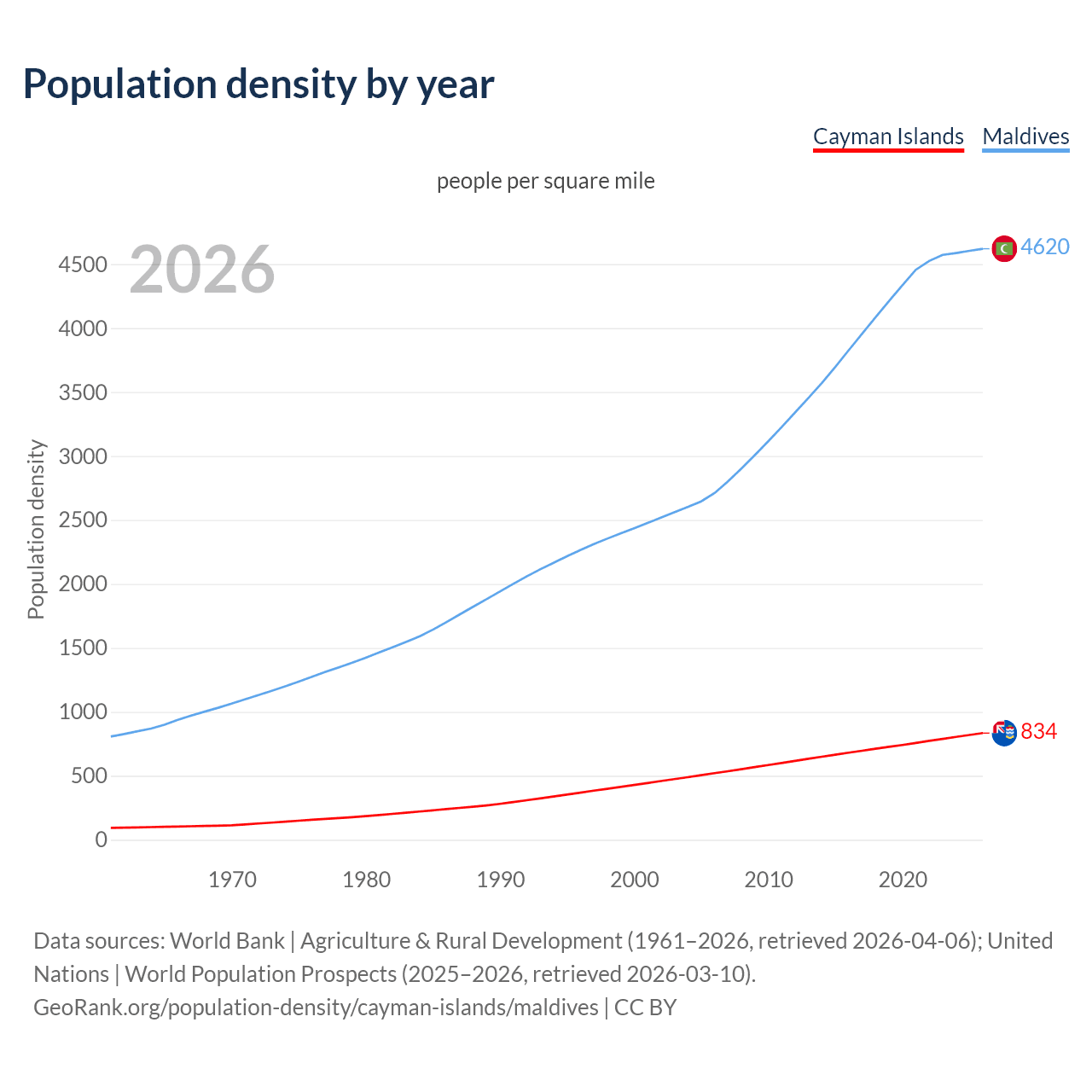 From 2006 to 2026, population density in the Cayman Islands increased by 60.2%, compared to a 70.5% growth in Maldives.