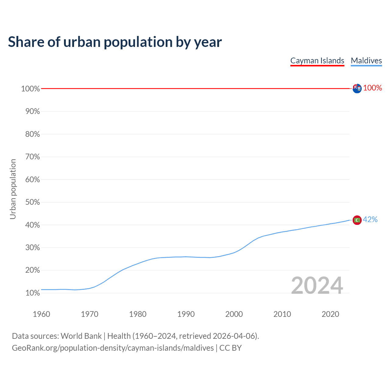 From 2004 to 2024, the share of urban population changed from 100% to 100% in the Cayman Islands and from 32.9% to 42% in Maldives.