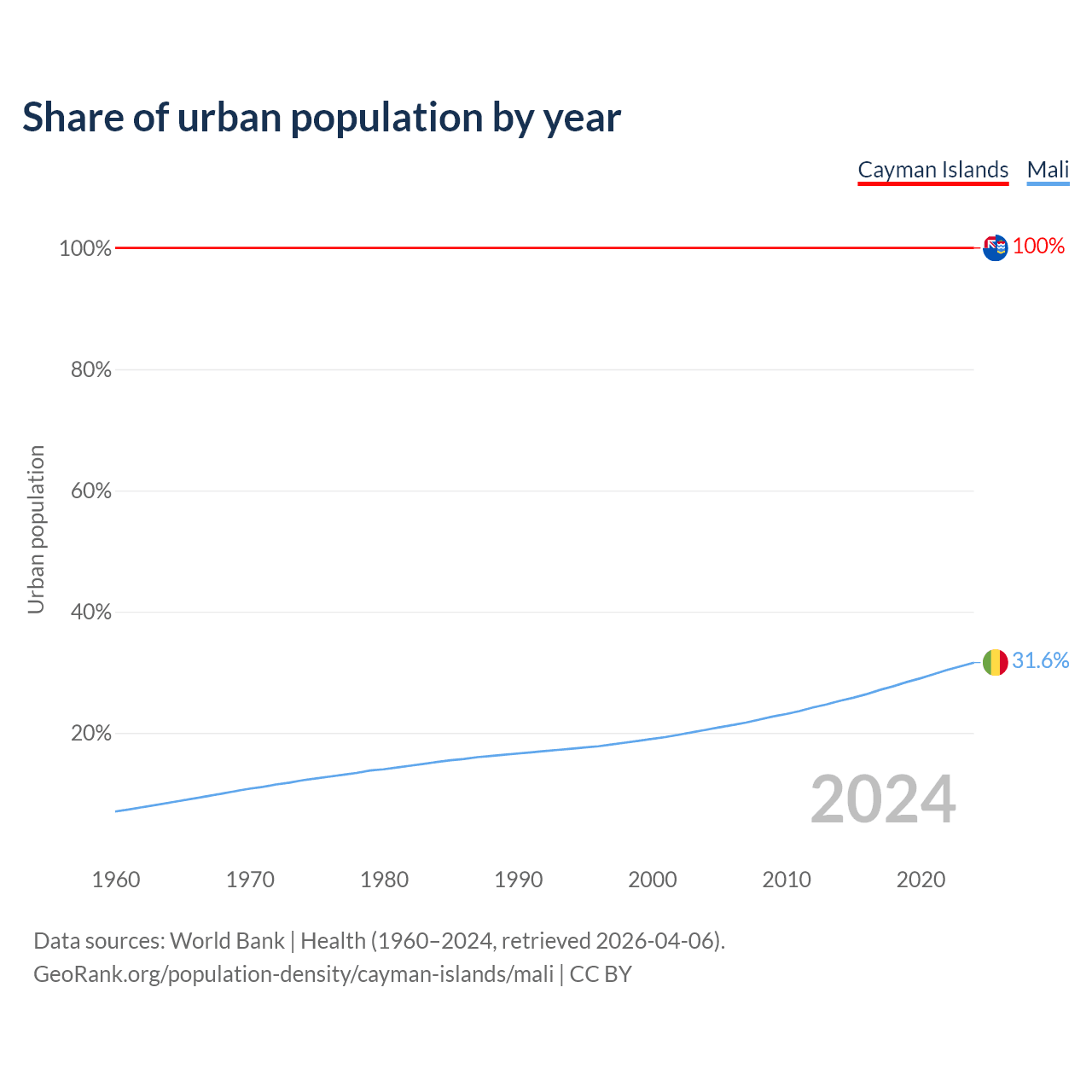 From 2004 to 2024, the share of urban population changed from 100% to 100% in the Cayman Islands and from 20.5% to 31.6% in Mali.