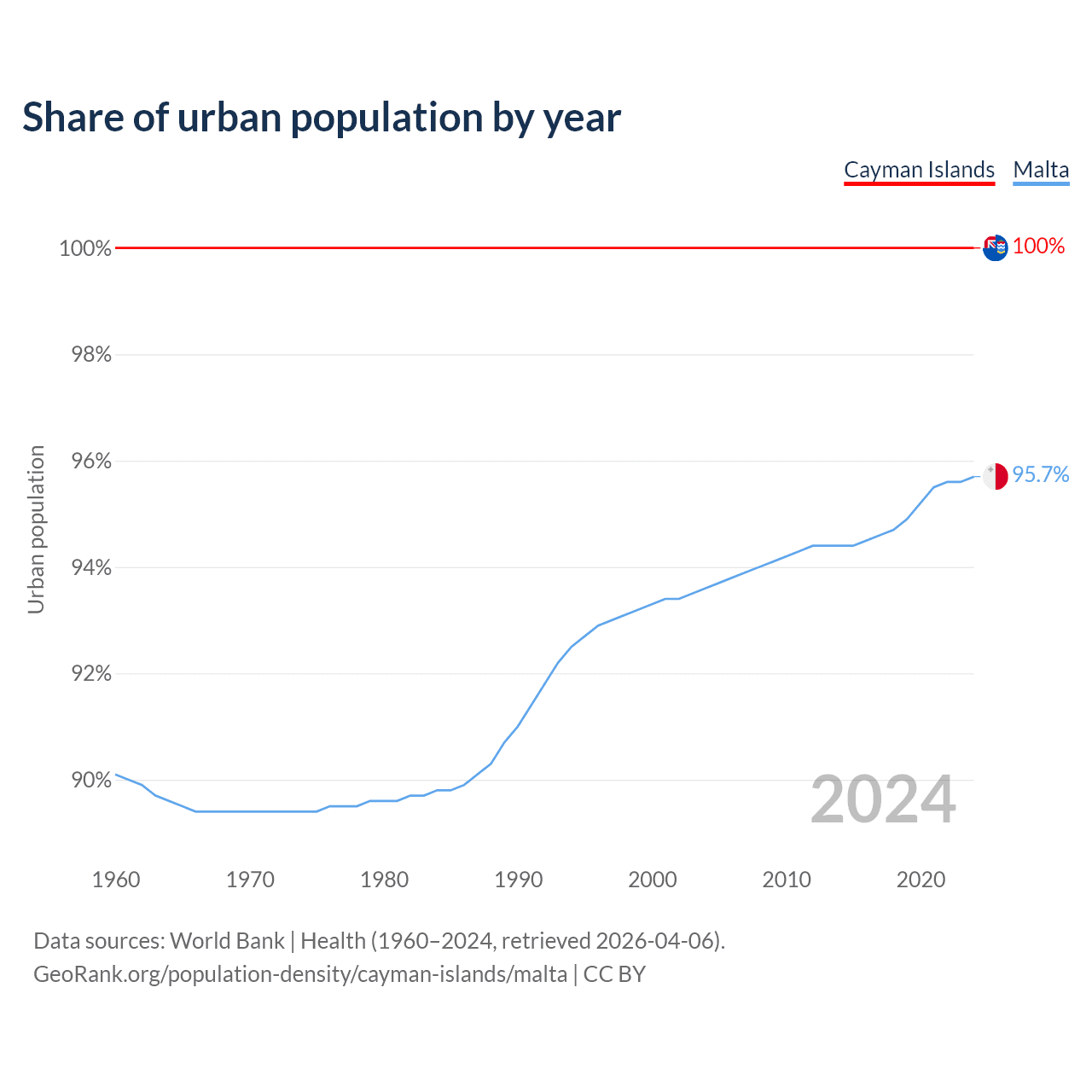 From 2004 to 2024, the share of urban population changed from 100% to 100% in the Cayman Islands and from 93.6% to 95.7% in Malta.