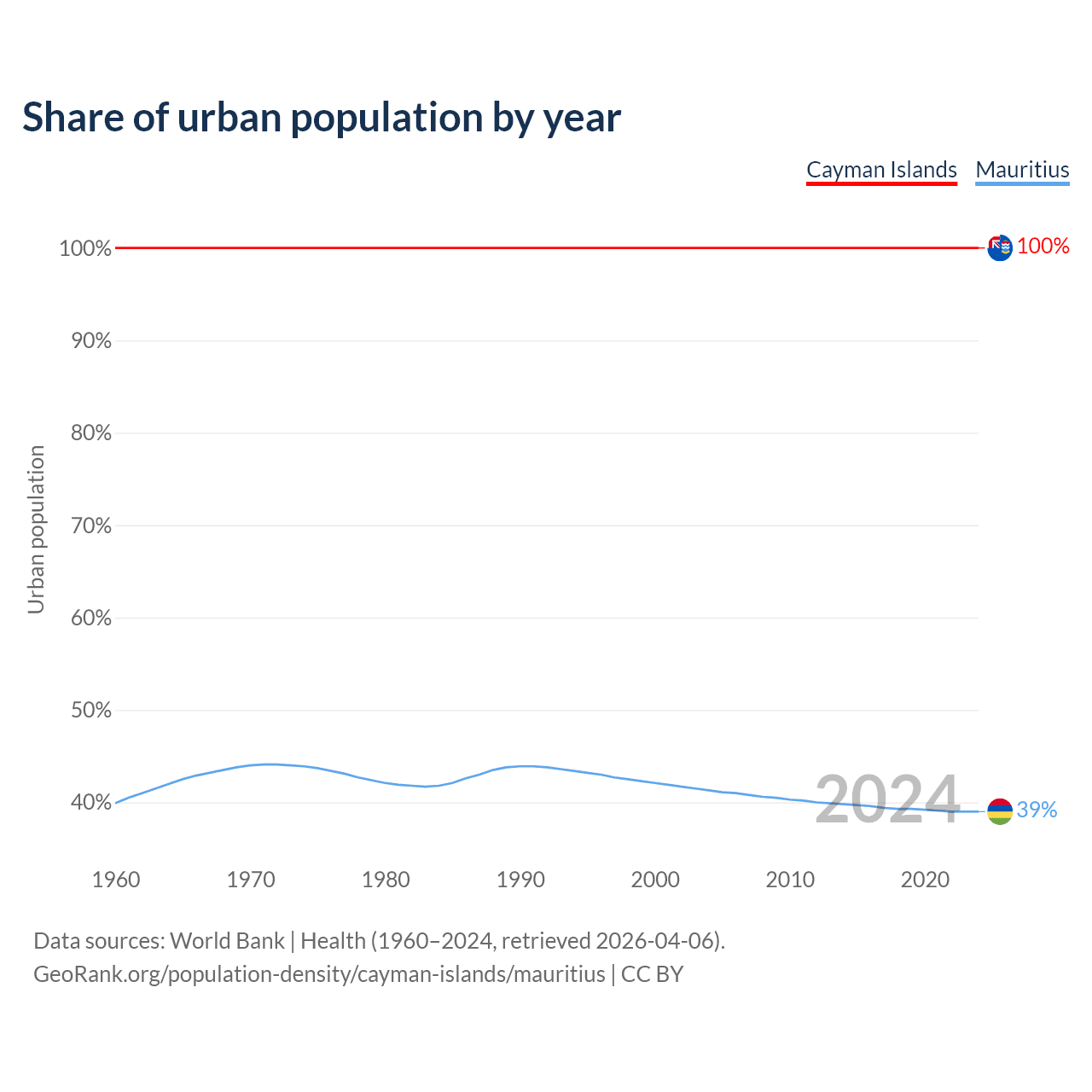 From 2004 to 2024, the share of urban population changed from 100% to 100% in the Cayman Islands and from 41.3% to 39% in Mauritius.