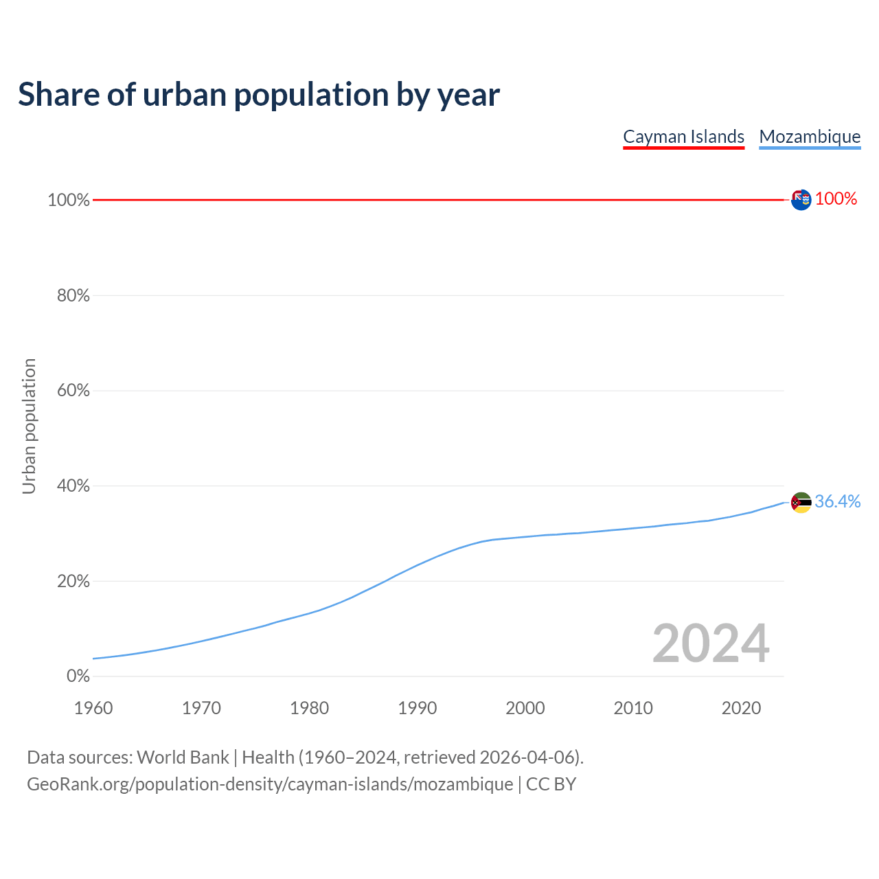 From 2004 to 2024, the share of urban population changed from 100% to 100% in the Cayman Islands and from 29.9% to 36.4% in Mozambique.