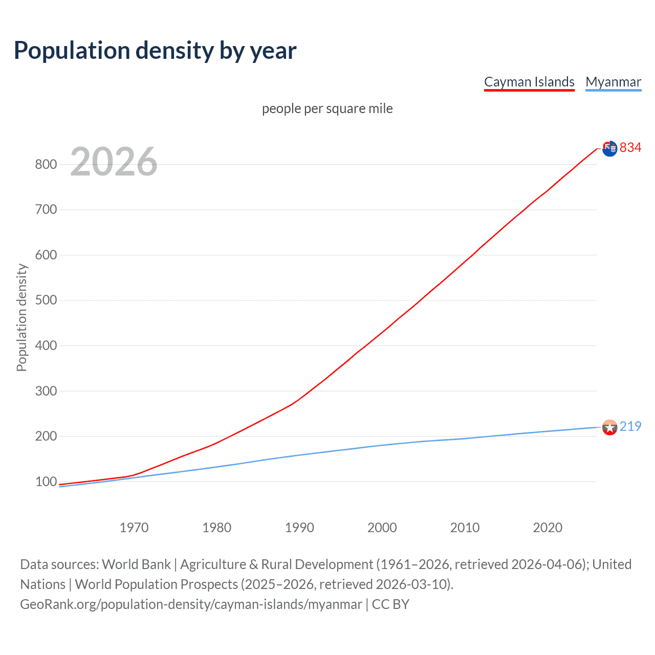 The Cayman Islands has a population density of 834 people per square mile compared to 219.1 people in Myanmar. The Cayman Islands has 38,165 sq ft of land per person vs 133,626 sq ft in Myanmar. The Cayman Islands and Myanmar rank 31st and 105th by population density, respectively.