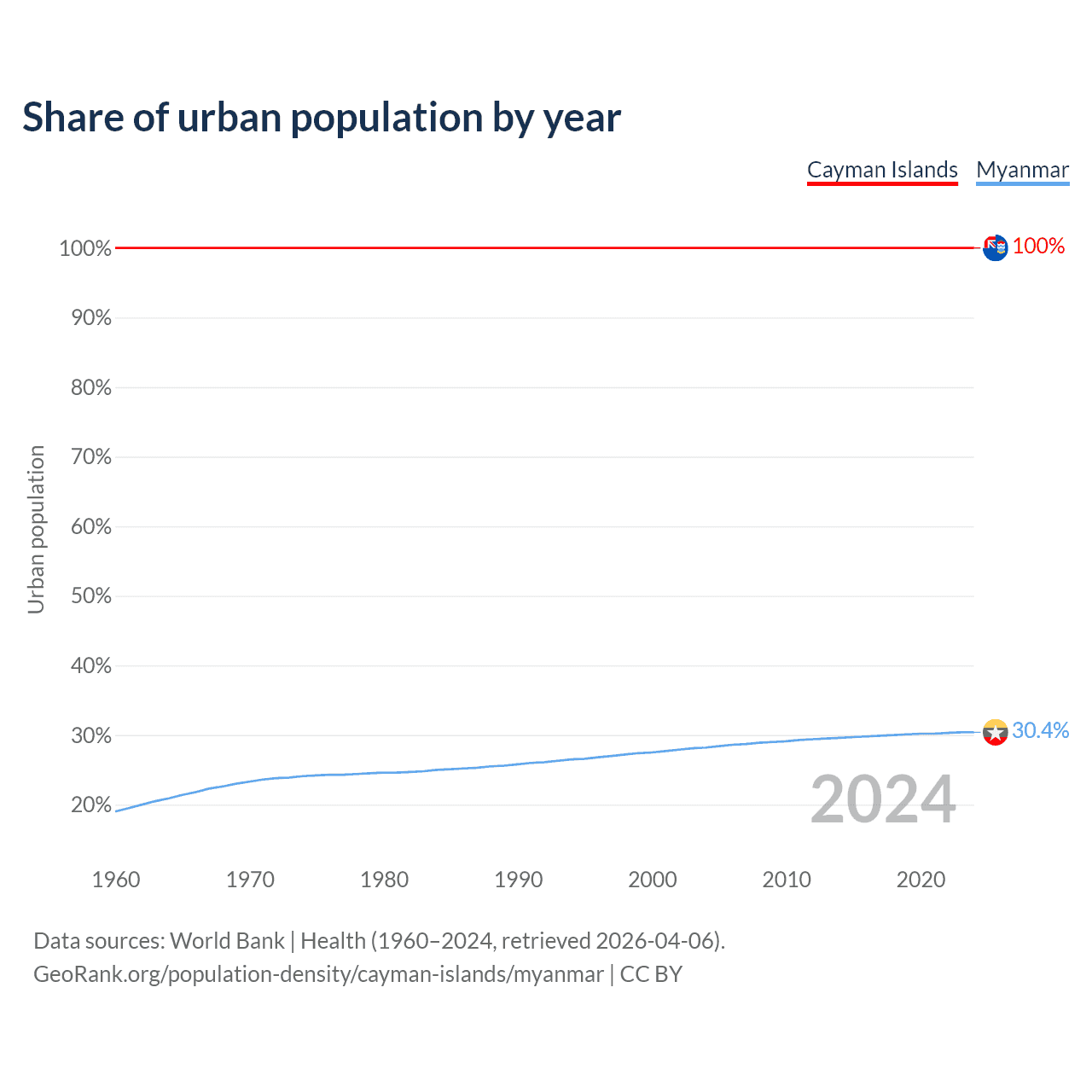 From 2004 to 2024, the share of urban population changed from 100% to 100% in the Cayman Islands and from 28.2% to 30.4% in Myanmar.