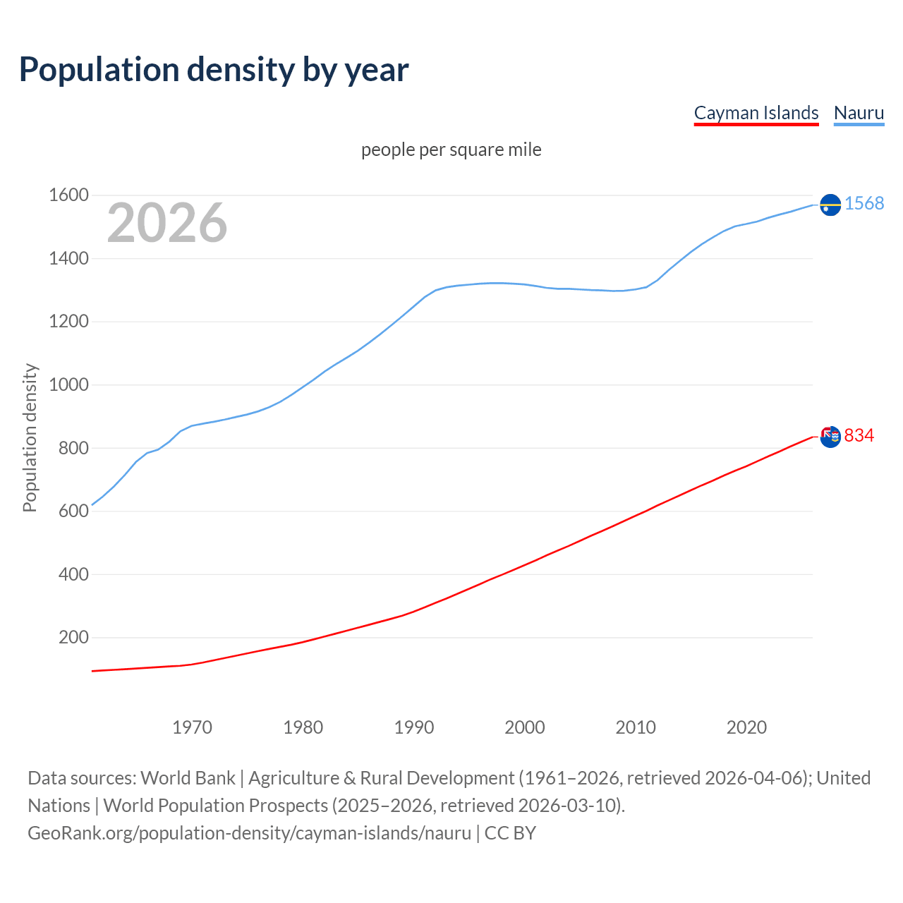 From 2006 to 2026, population density in the Cayman Islands increased by 60.2%, compared to a 20.6% growth in Nauru.