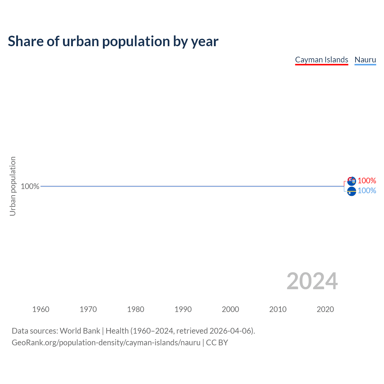 From 2004 to 2024, the share of urban population changed from 100% to 100% in the Cayman Islands and from 100% to 100% in Nauru.