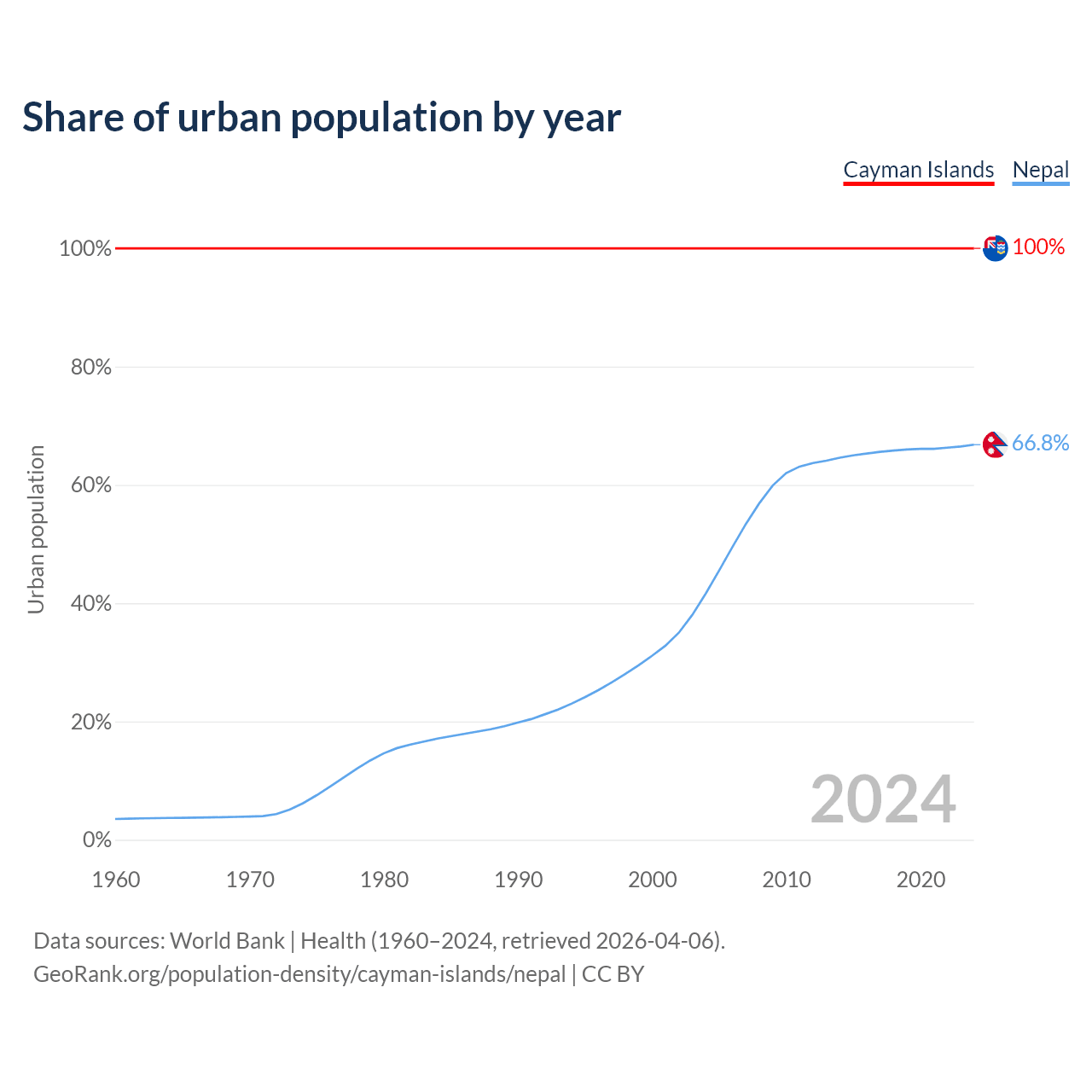From 2004 to 2024, the share of urban population changed from 100% to 100% in the Cayman Islands and from 41.6% to 66.8% in Nepal.