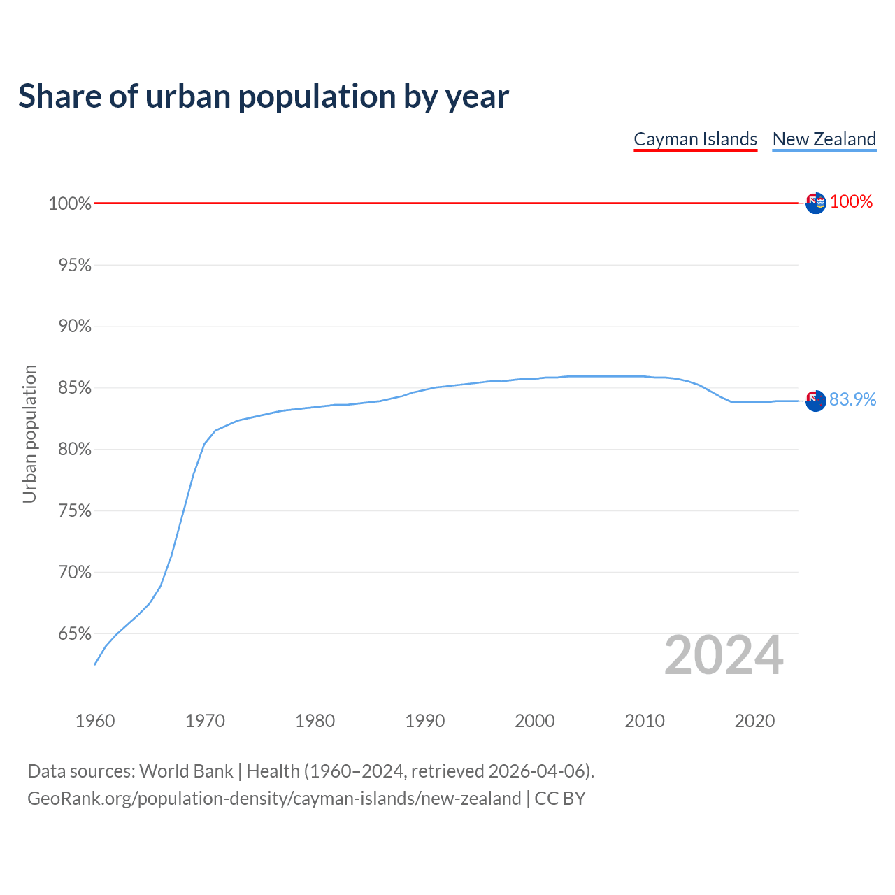 From 2004 to 2024, the share of urban population changed from 100% to 100% in the Cayman Islands and from 85.9% to 83.9% in New Zealand.