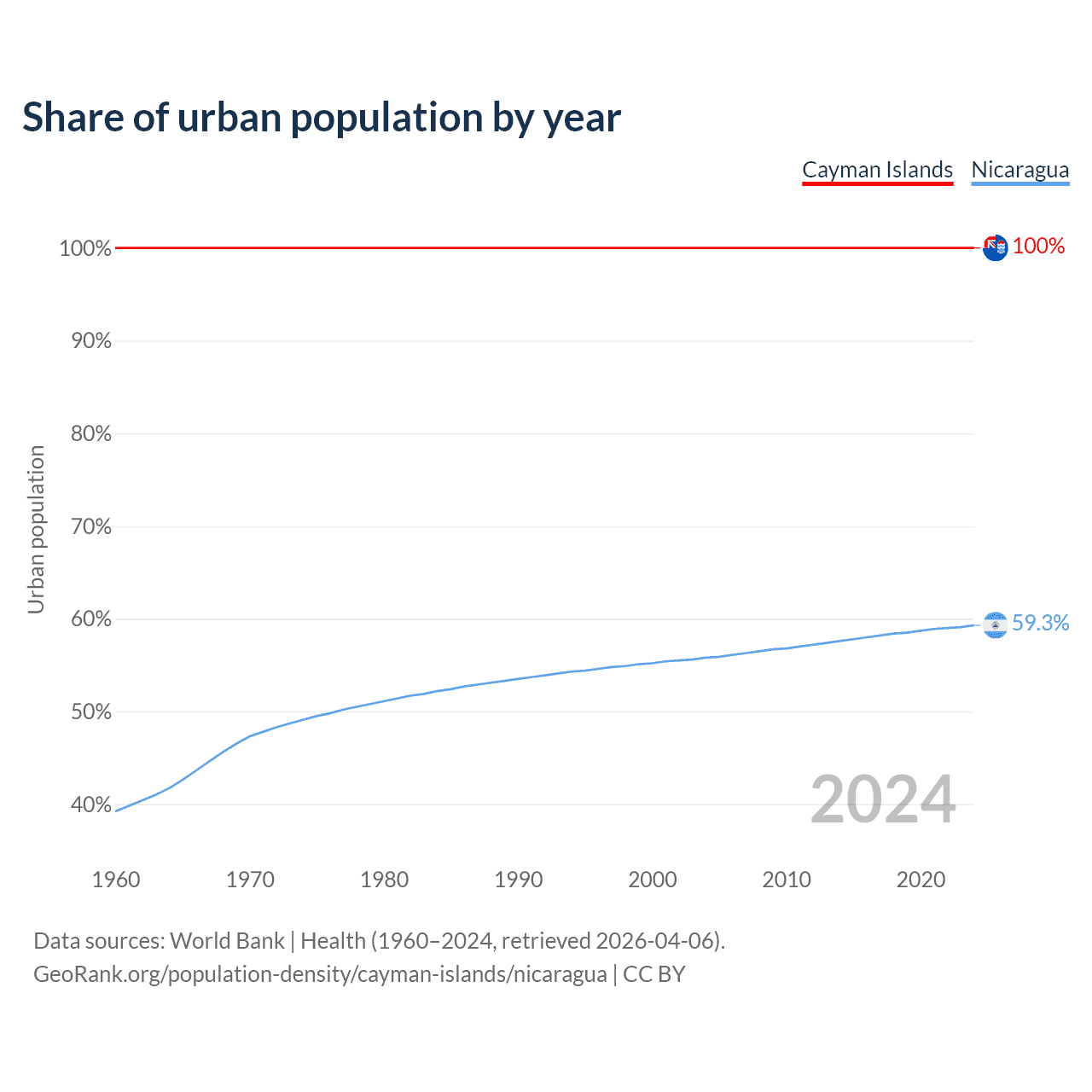 From 2004 to 2024, the share of urban population changed from 100% to 100% in the Cayman Islands and from 55.8% to 59.3% in Nicaragua.