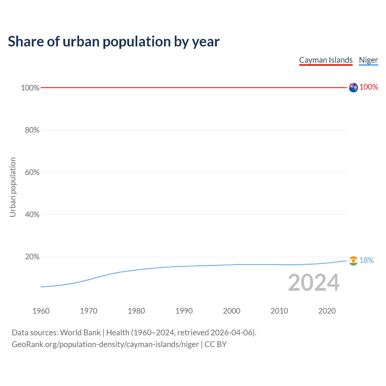 From 2004 to 2024, the share of urban population changed from 100% to 100% in the Cayman Islands and from 16.3% to 18% in Niger.