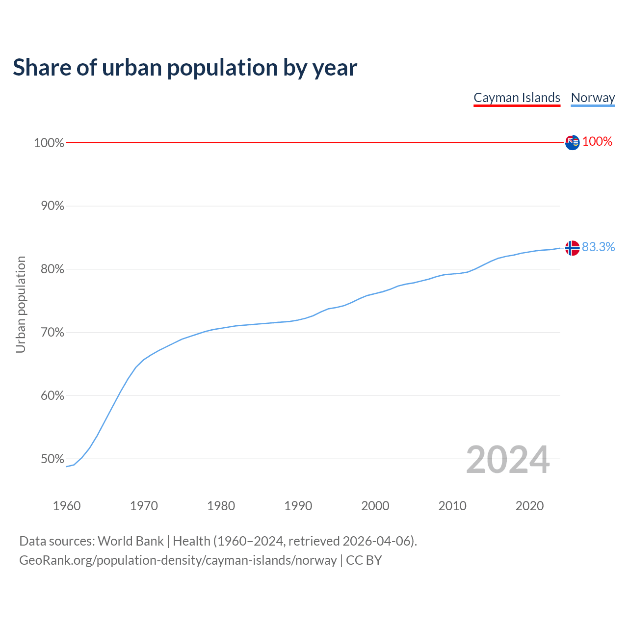 From 2004 to 2024, the share of urban population changed from 100% to 100% in the Cayman Islands and from 77.6% to 83.3% in Norway.