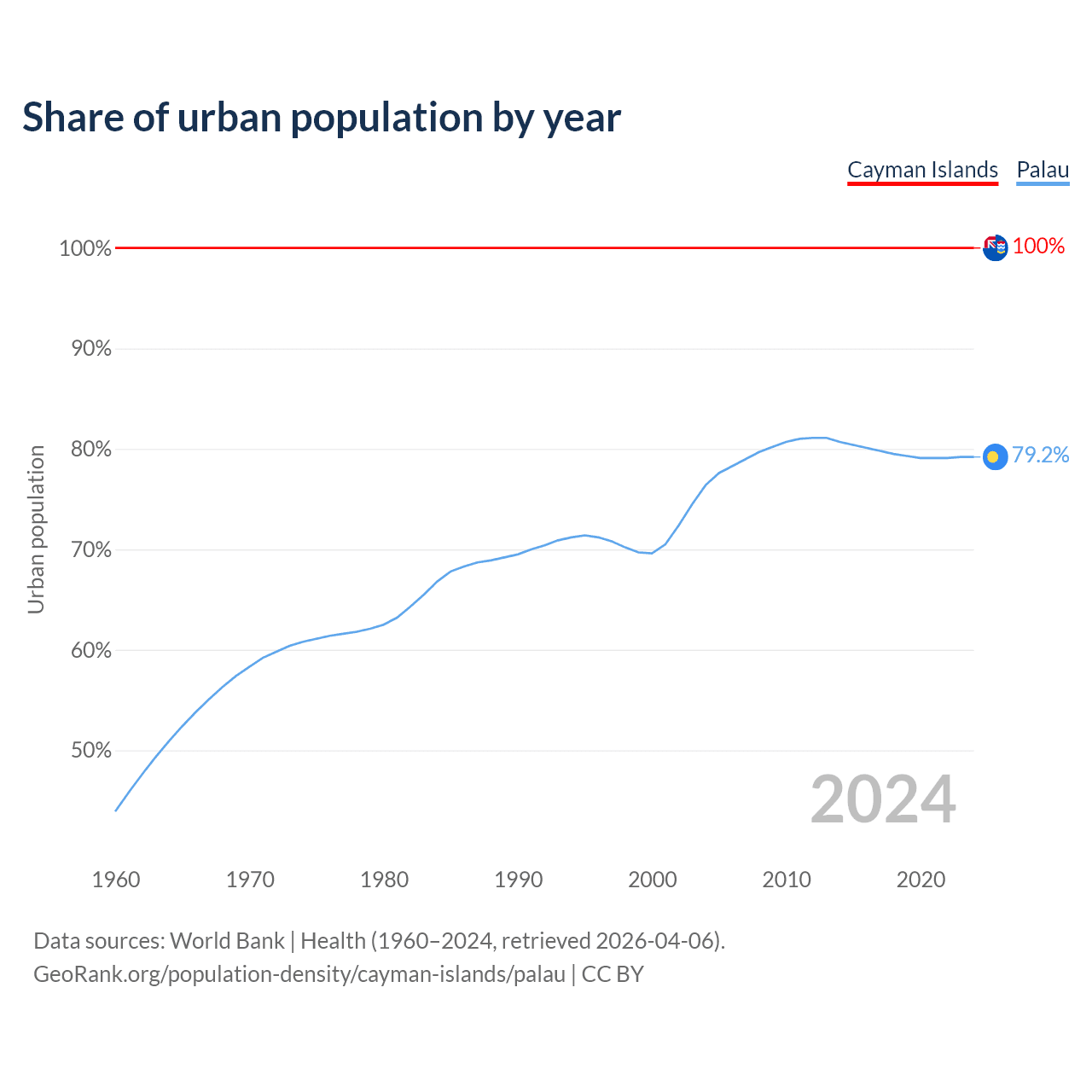From 2004 to 2024, the share of urban population changed from 100% to 100% in the Cayman Islands and from 76.4% to 79.2% in Palau.
