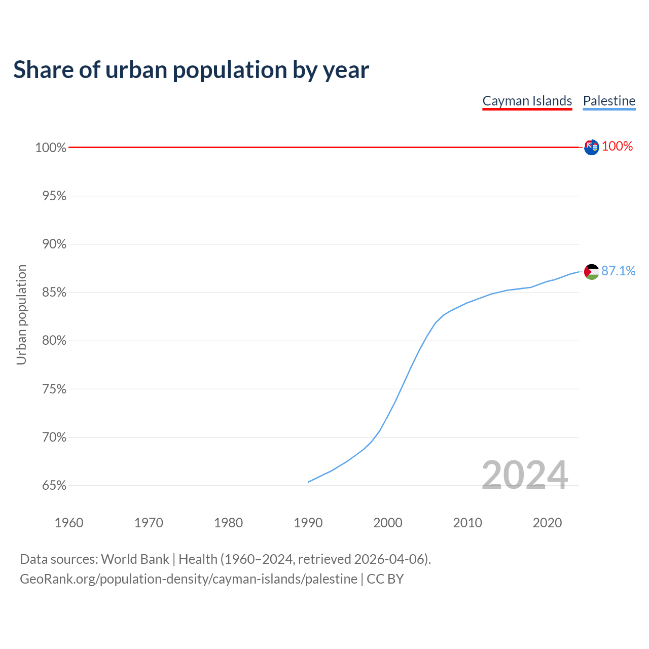 From 2004 to 2024, the share of urban population changed from 100% to 100% in the Cayman Islands and from 79% to 87.1% in Palestine.