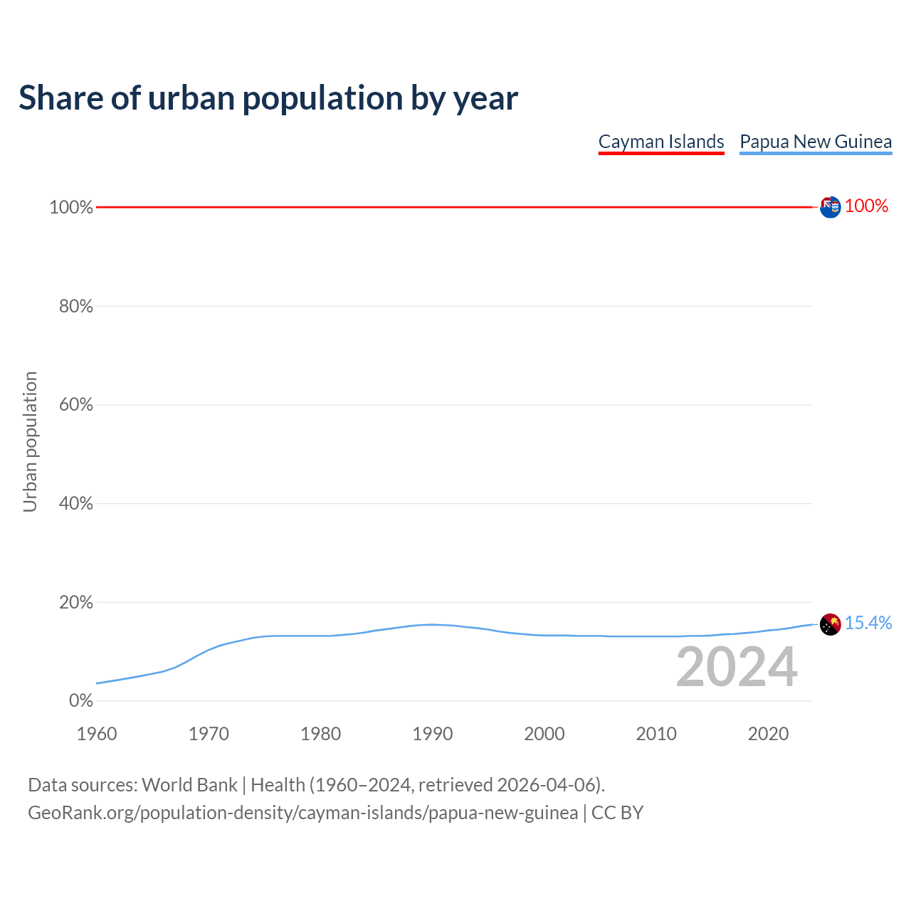 From 2004 to 2024, the share of urban population changed from 100% to 100% in the Cayman Islands and from 13.1% to 15.4% in Papua New Guinea.