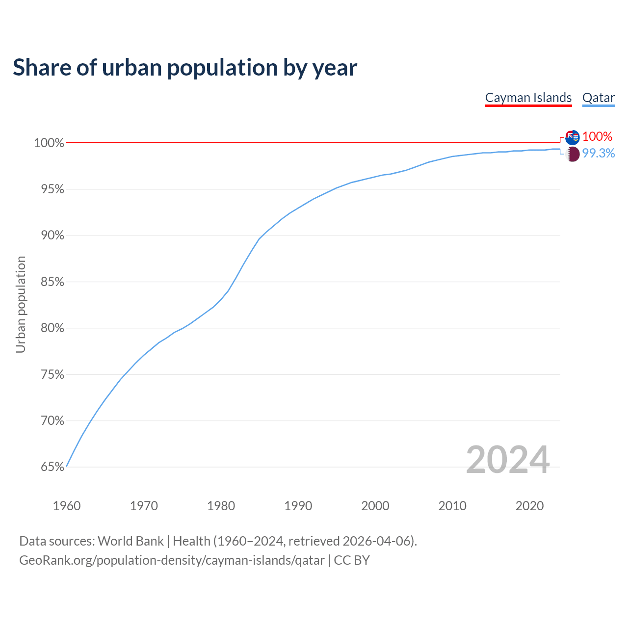 From 2004 to 2024, the share of urban population changed from 100% to 100% in the Cayman Islands and from 97% to 99.3% in Qatar.