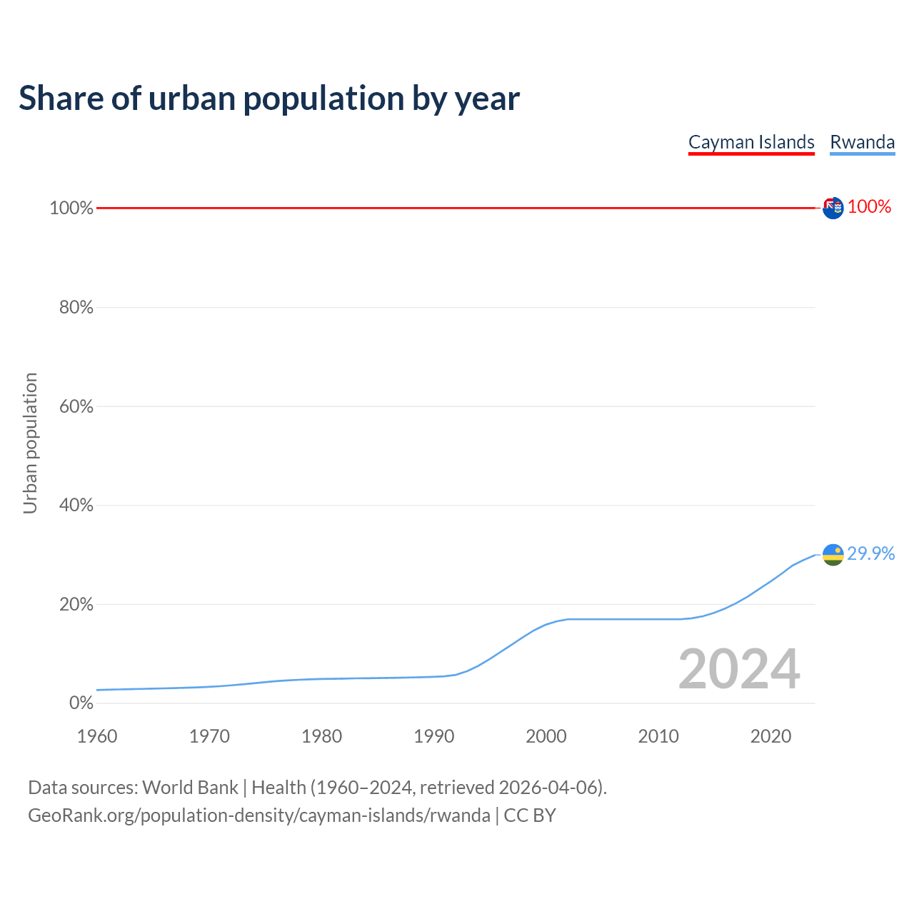 From 2004 to 2024, the share of urban population changed from 100% to 100% in the Cayman Islands and from 16.9% to 29.9% in Rwanda.
