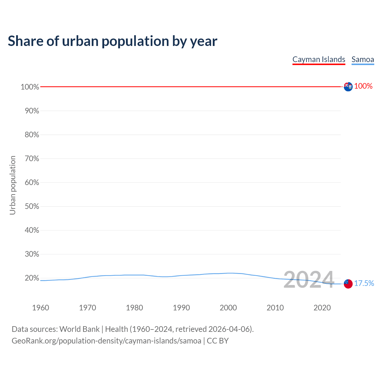 From 2004 to 2024, the share of urban population changed from 100% to 100% in the Cayman Islands and from 21.5% to 17.5% in Samoa.