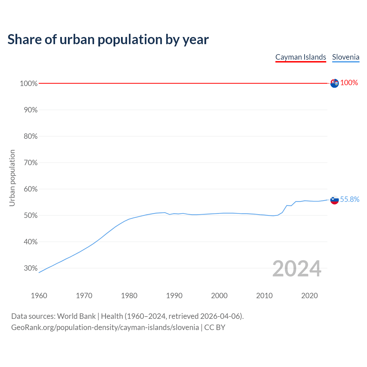 From 2004 to 2024, the share of urban population changed from 100% to 100% in the Cayman Islands and from 50.7% to 55.8% in Slovenia.