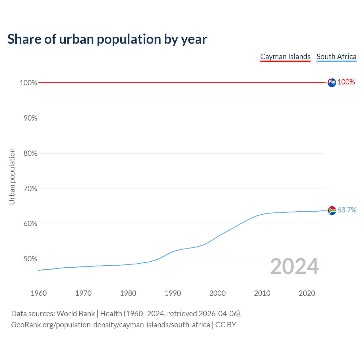 From 2004 to 2024, the share of urban population changed from 100% to 100% in the Cayman Islands and from 59.1% to 63.7% in South Africa.