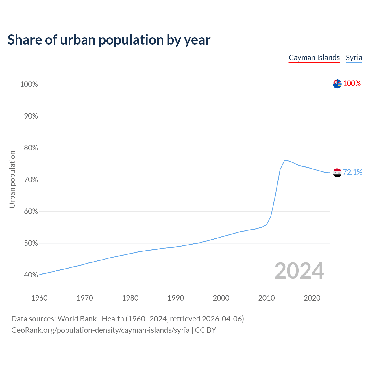 From 2004 to 2024, the share of urban population changed from 100% to 100% in the Cayman Islands and from 53.5% to 72.1% in Syria.