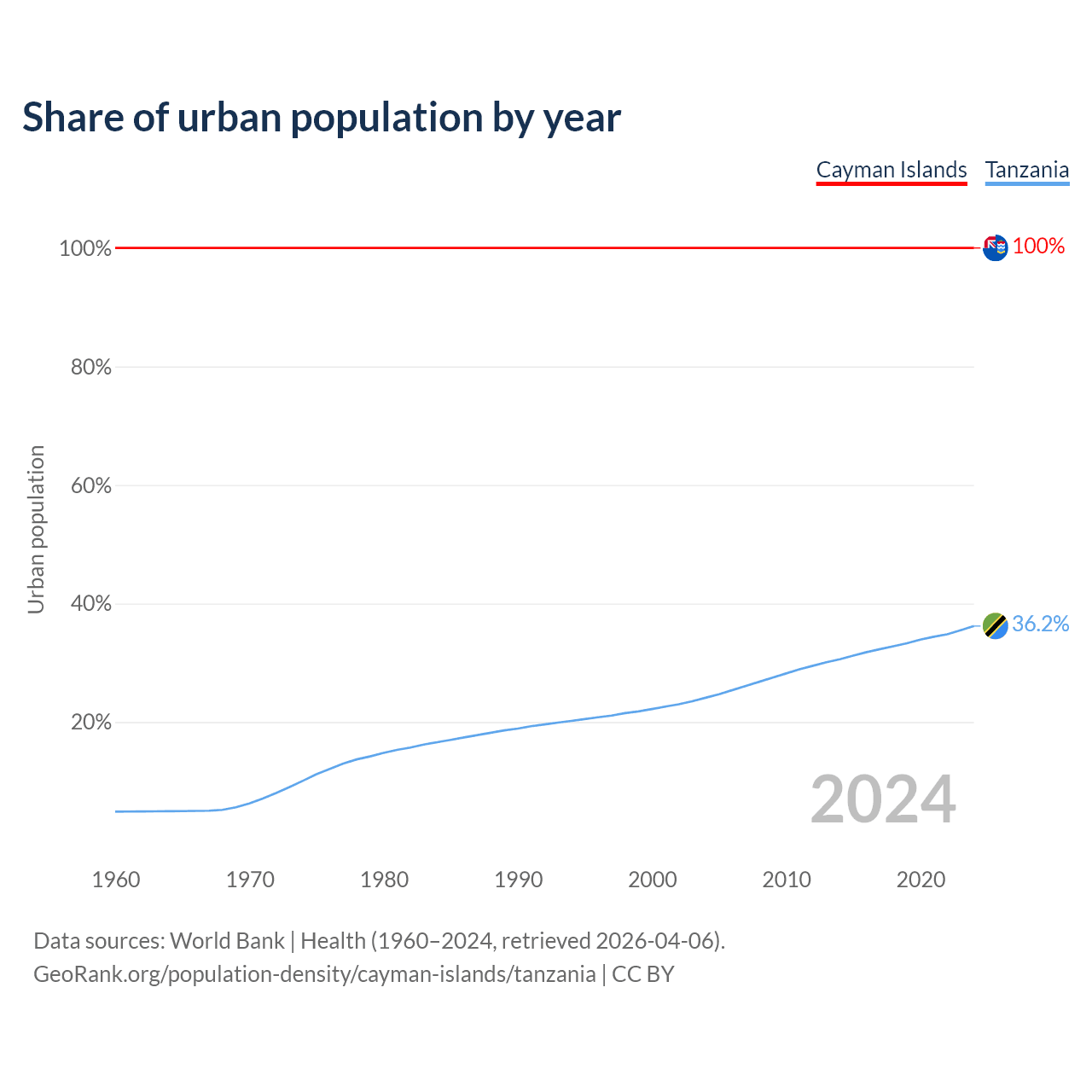 From 2004 to 2024, the share of urban population changed from 100% to 100% in the Cayman Islands and from 24.1% to 36.2% in Tanzania.