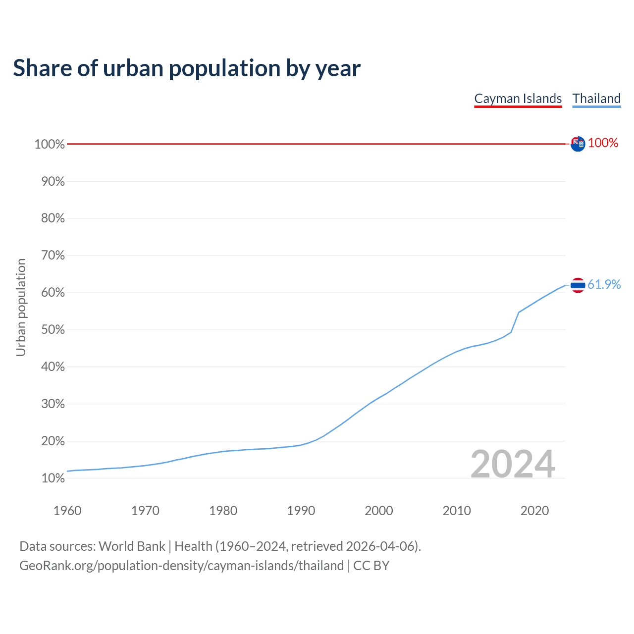 From 2004 to 2024, the share of urban population changed from 100% to 100% in the Cayman Islands and from 36.8% to 61.9% in Thailand.