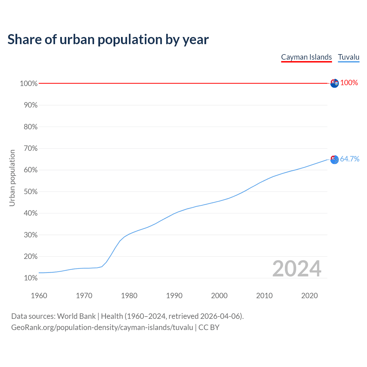 From 2004 to 2024, the share of urban population changed from 100% to 100% in the Cayman Islands and from 48.4% to 64.7% in Tuvalu.