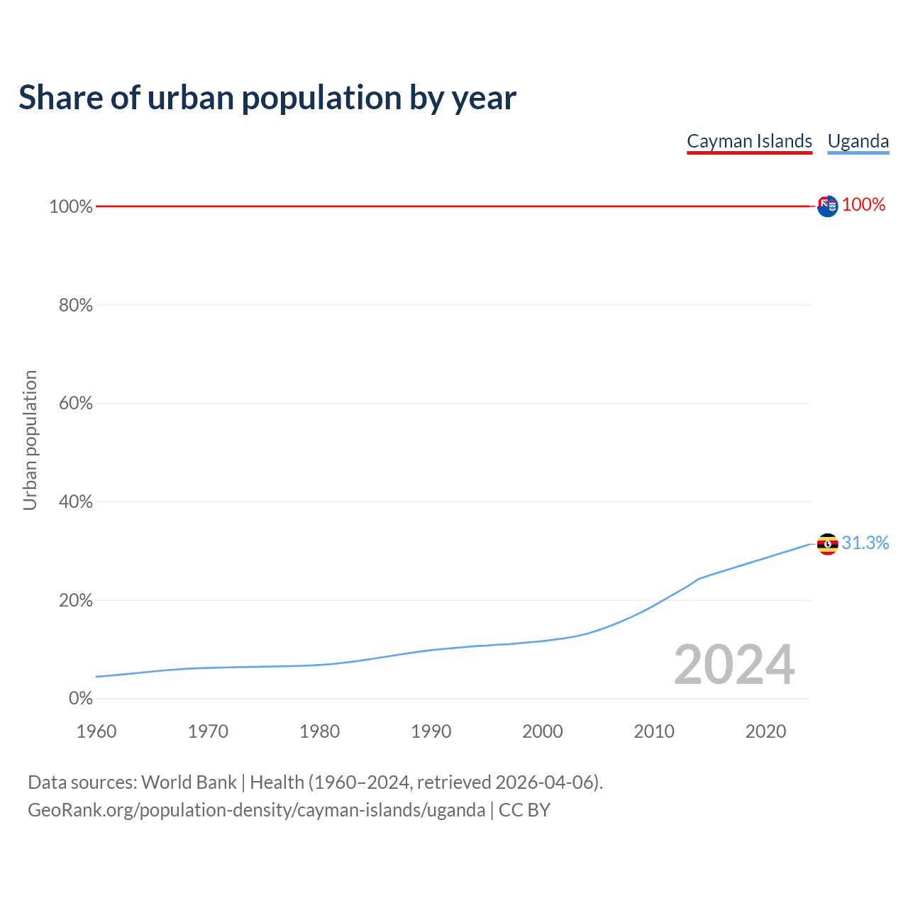 From 2004 to 2024, the share of urban population changed from 100% to 100% in the Cayman Islands and from 13.1% to 31.3% in Uganda.