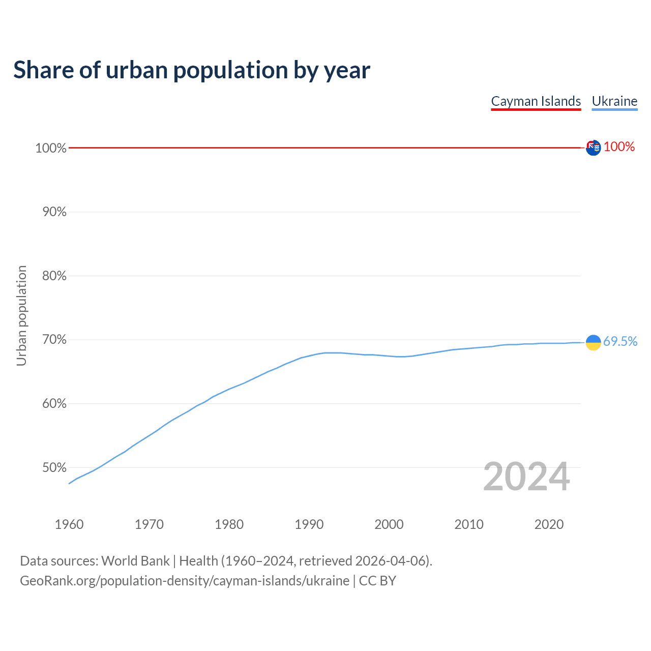 From 2004 to 2024, the share of urban population changed from 100% to 100% in the Cayman Islands and from 67.6% to 69.5% in Ukraine.