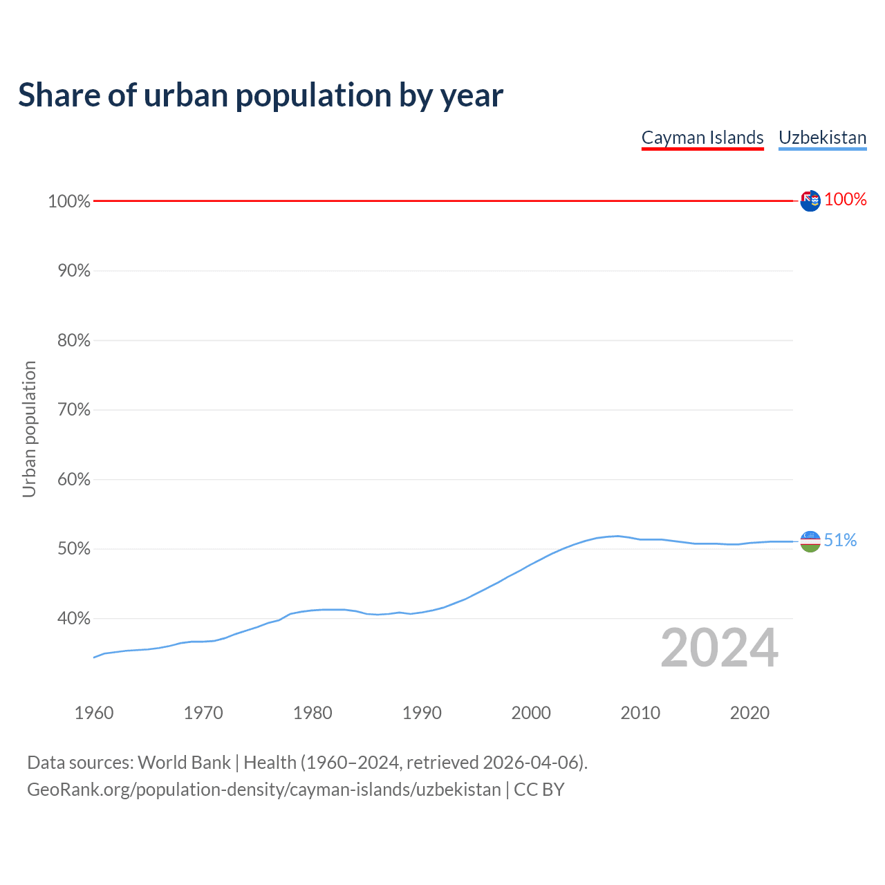 From 2004 to 2024, the share of urban population changed from 100% to 100% in the Cayman Islands and from 50.6% to 51% in Uzbekistan.