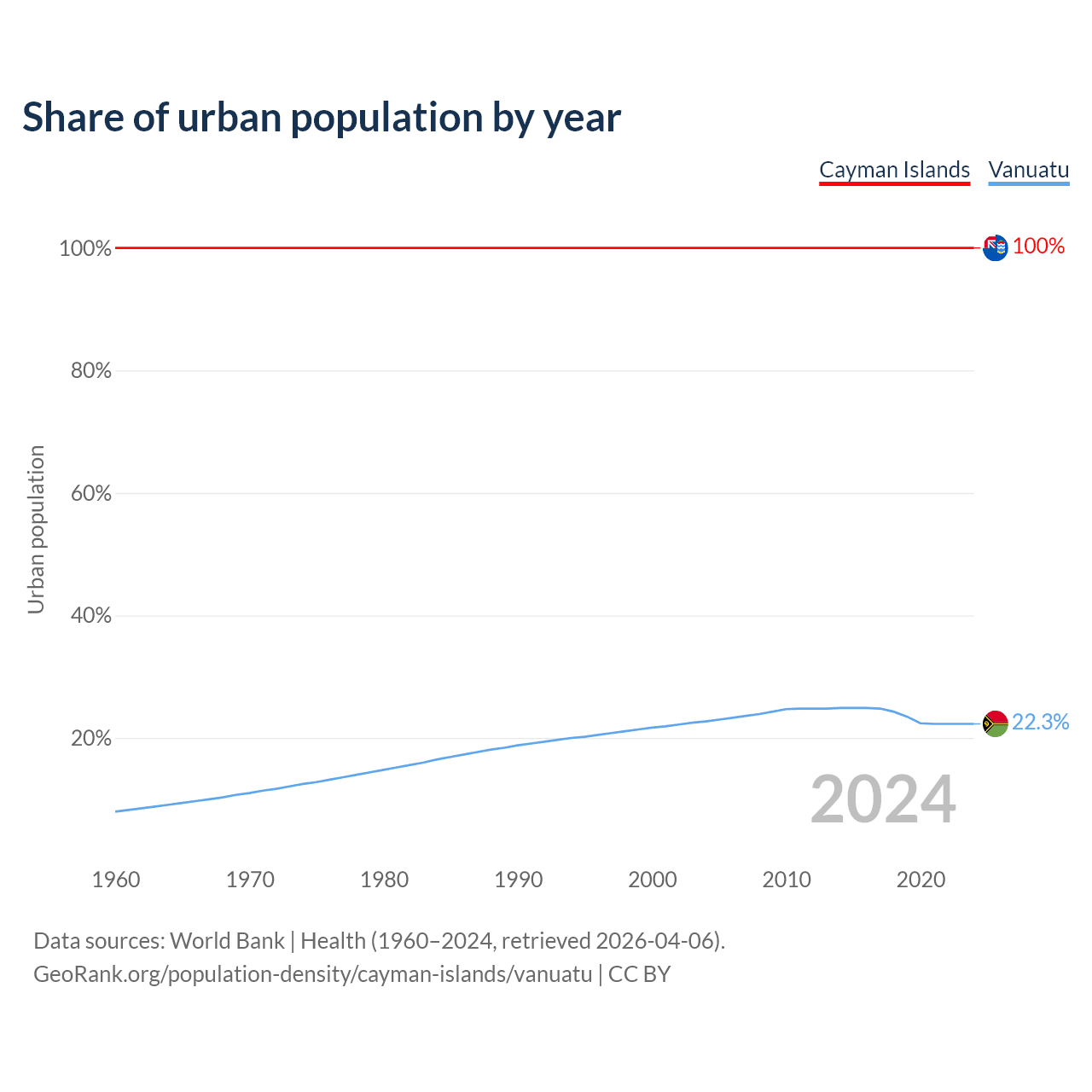 From 2004 to 2024, the share of urban population changed from 100% to 100% in the Cayman Islands and from 22.7% to 22.3% in Vanuatu.