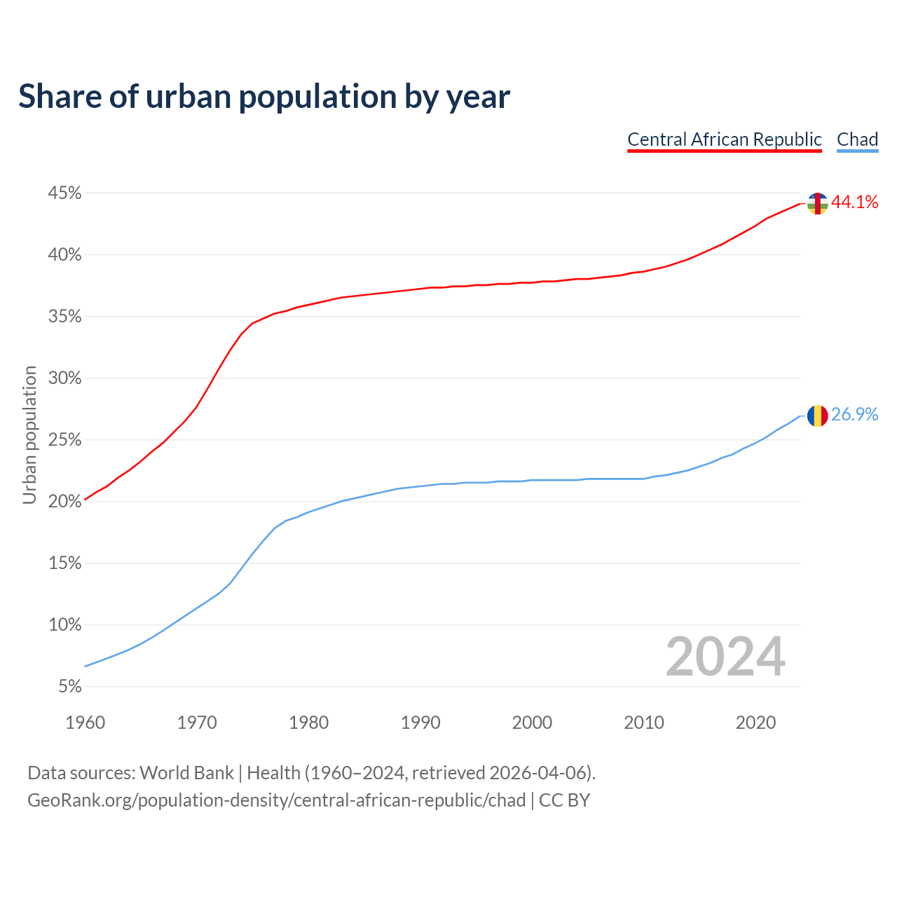 From 2004 to 2024, the share of urban population changed from 38% to 44.1% in the Central African Republic and from 21.7% to 26.9% in Chad.