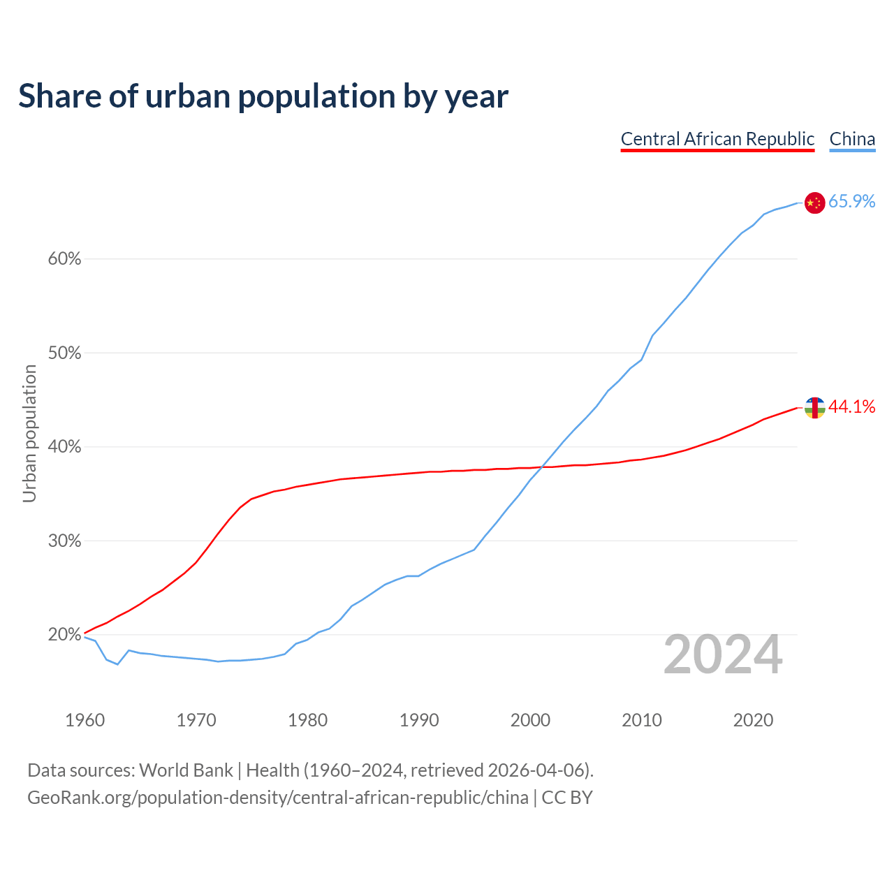 From 2004 to 2024, the share of urban population changed from 38% to 44.1% in the Central African Republic and from 41.8% to 65.9% in China.