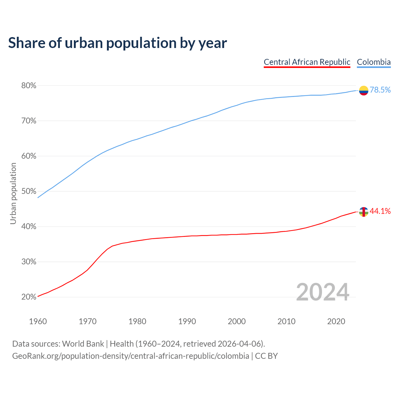 From 2004 to 2024, the share of urban population changed from 38% to 44.1% in the Central African Republic and from 75.8% to 78.5% in Colombia.