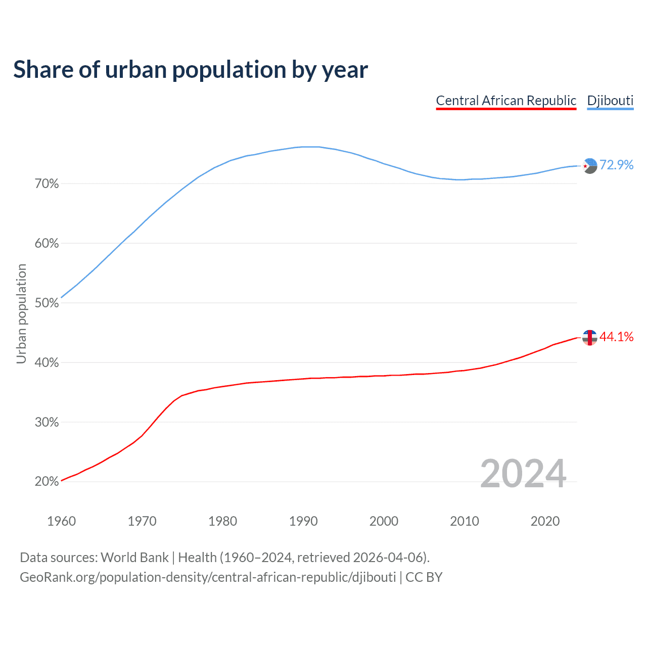 From 2004 to 2024, the share of urban population changed from 38% to 44.1% in the Central African Republic and from 71.6% to 72.9% in Djibouti.