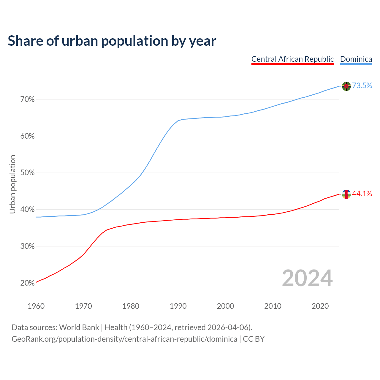 From 2004 to 2024, the share of urban population changed from 38% to 44.1% in the Central African Republic and from 66% to 73.5% in Dominica.